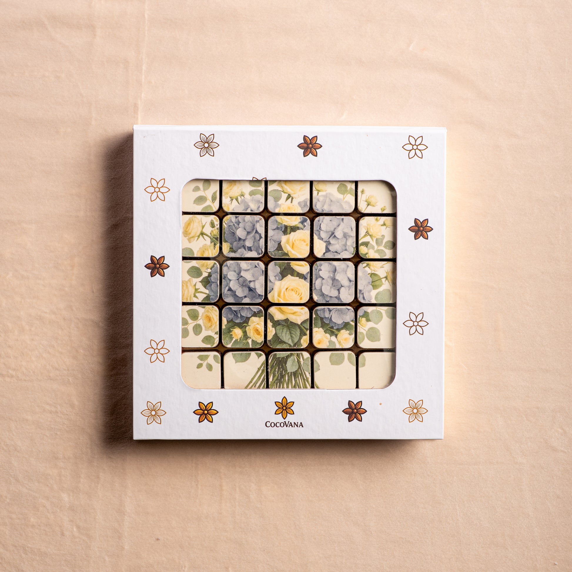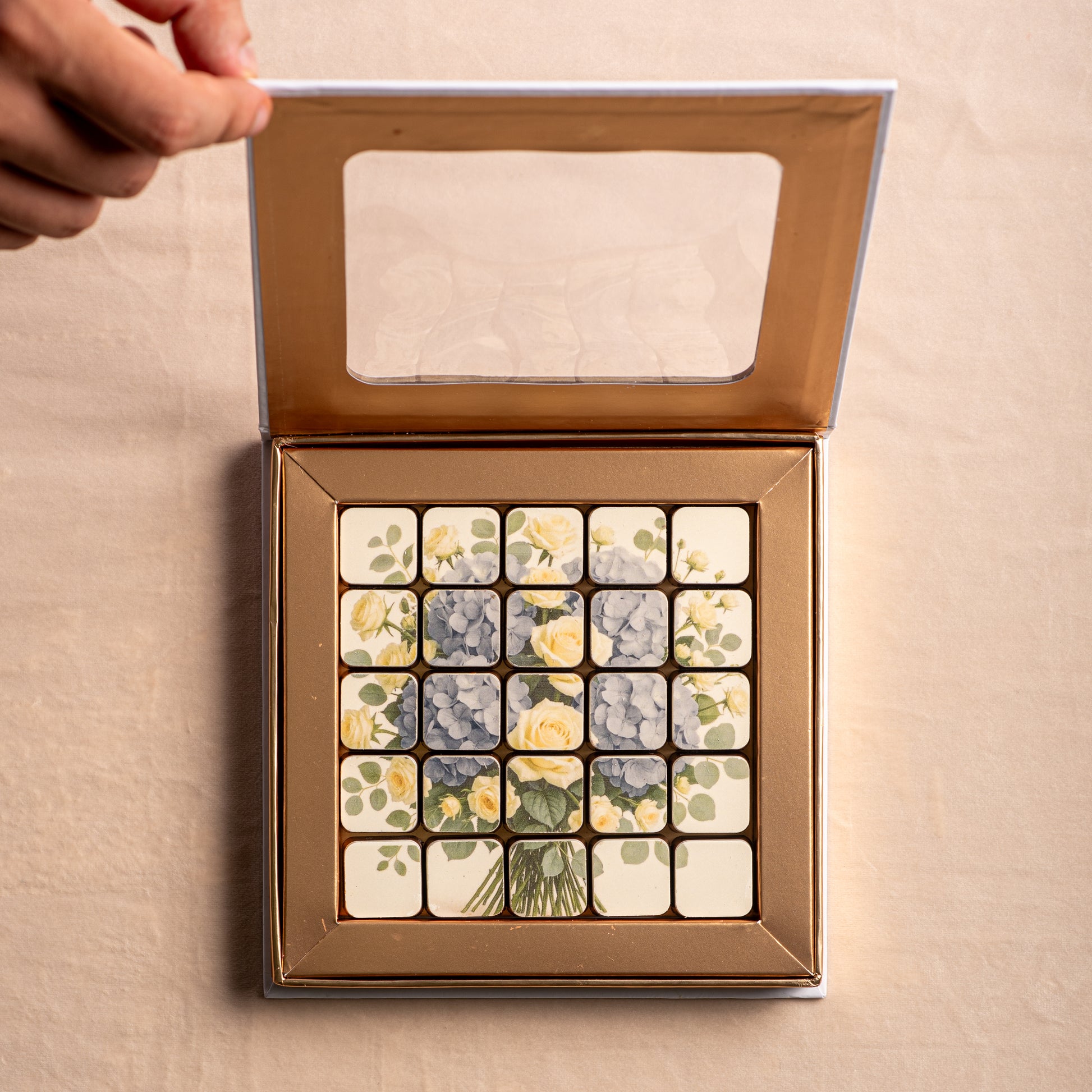 This stunning set features 25 handcrafted bonbons printed with one of our designs — each chocolate a piece of edible art. Paired with a a bouquet, it’s the perfect gift when words aren’t enough.
