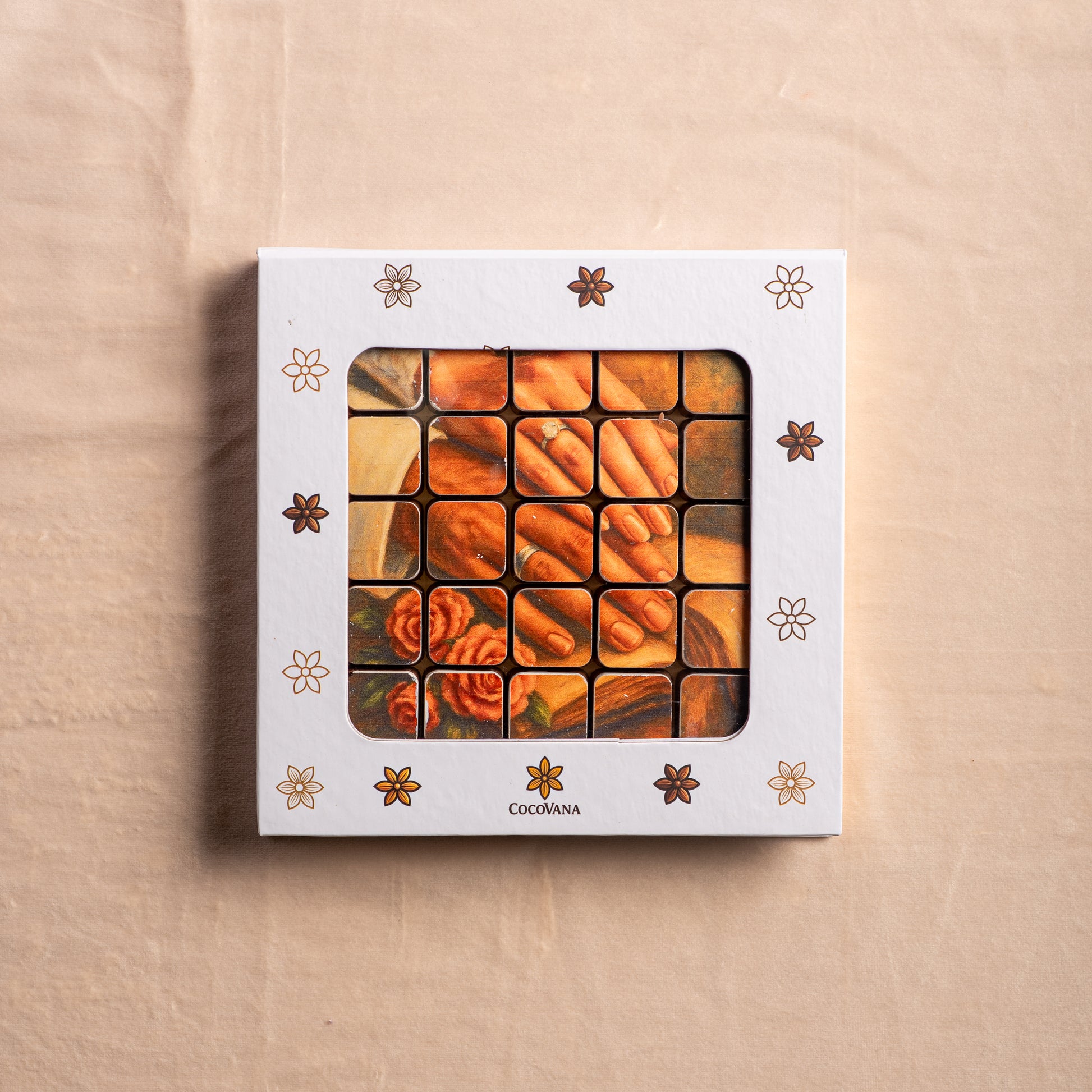 This 25-piece bonbon box features a stunning puzzle design, printed seamlessly across handcrafted chocolates with rich, assorted fillings.