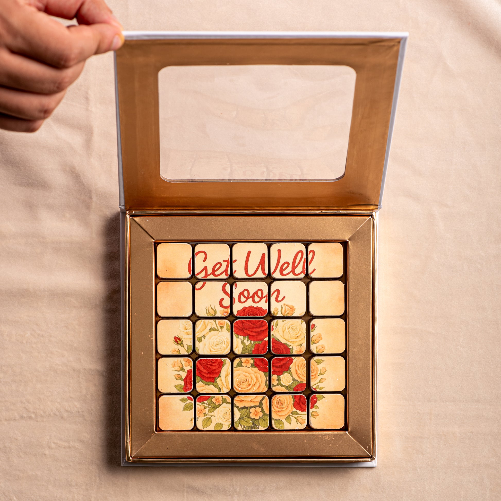 This 25-piece bonbon box features a stunning puzzle design, printed seamlessly across handcrafted chocolates with rich, assorted fillings.