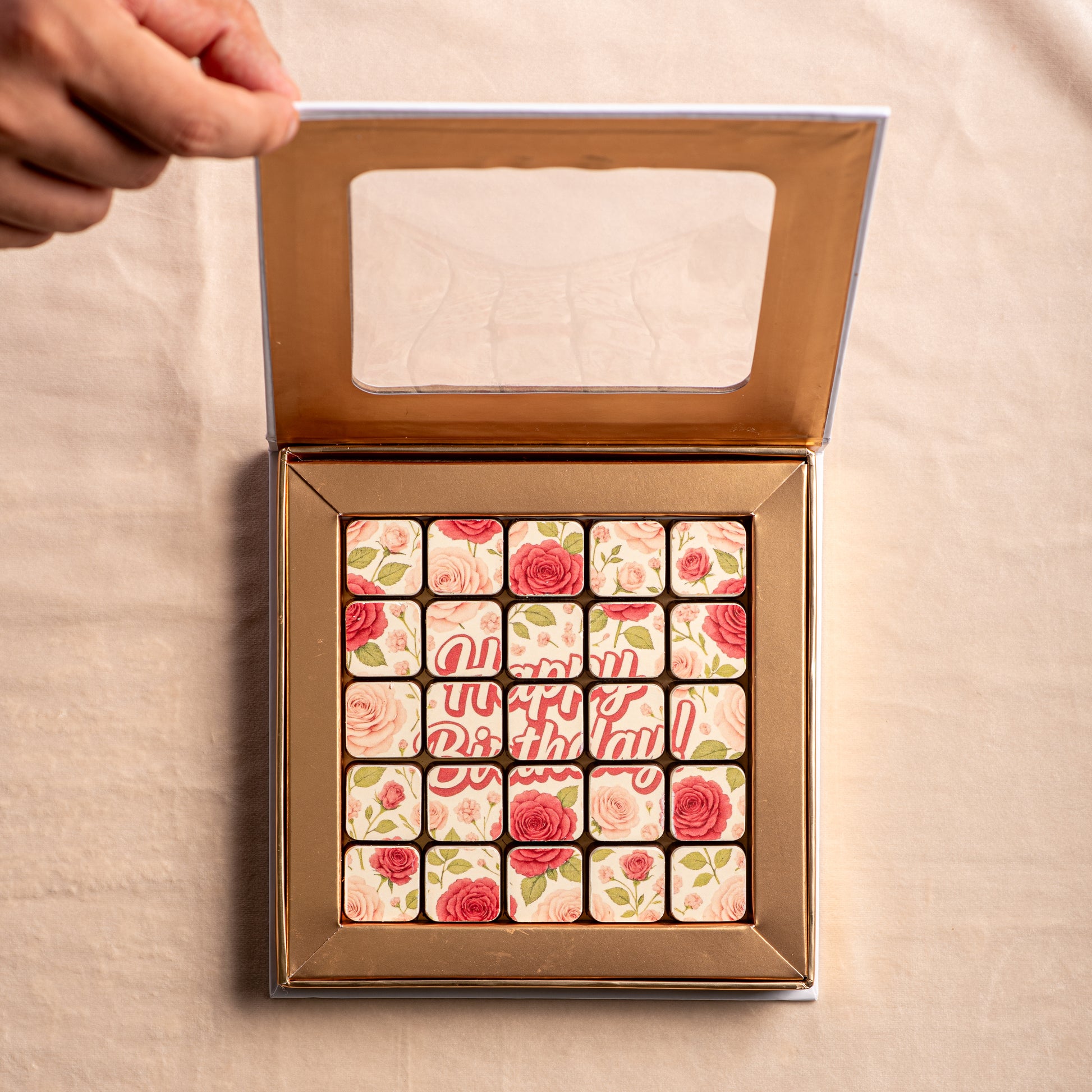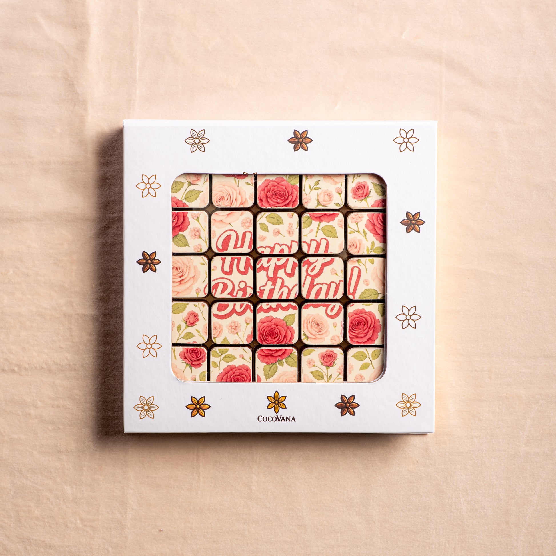 This 25-piece bonbon box features a stunning puzzle design, printed seamlessly across handcrafted chocolates with rich, assorted fillings.