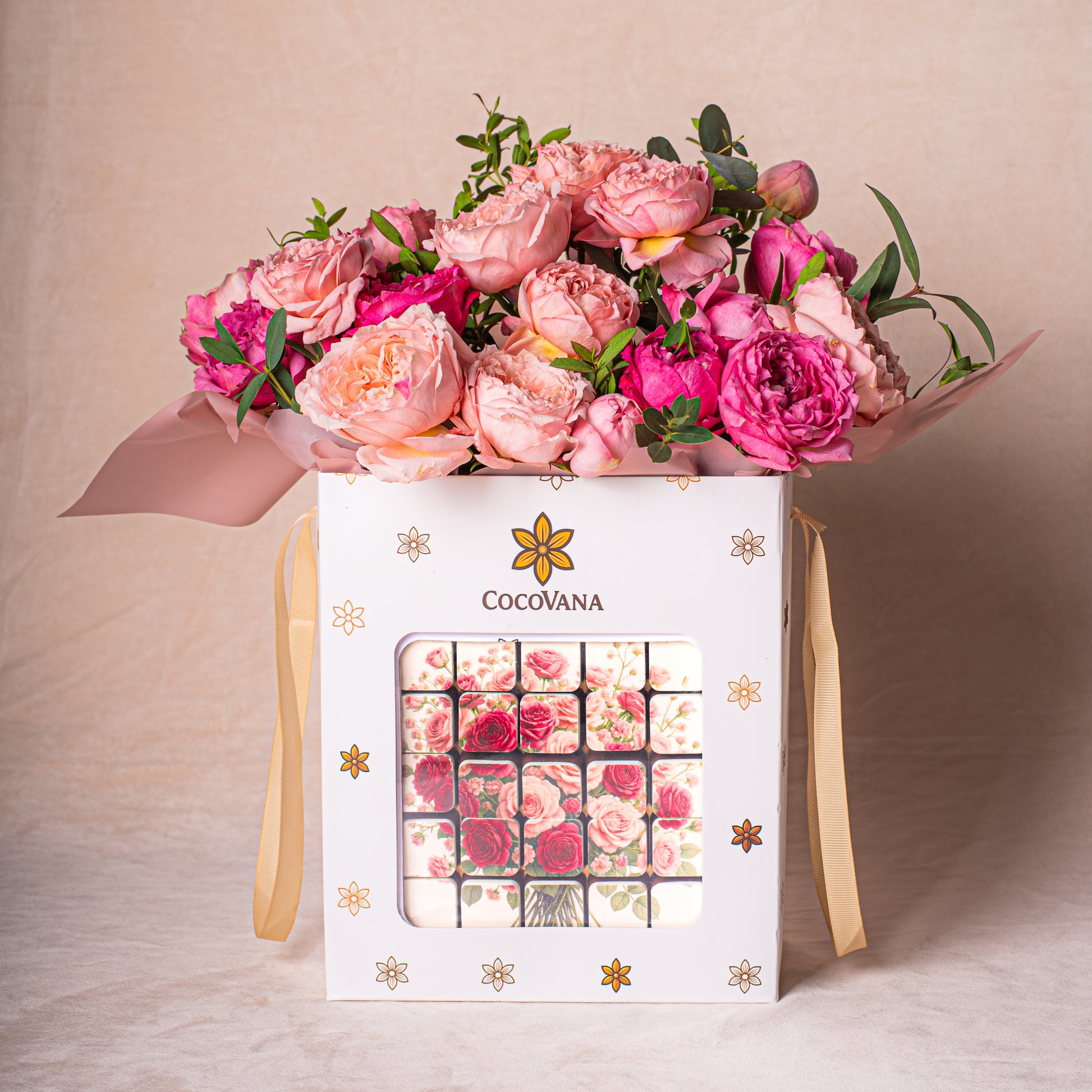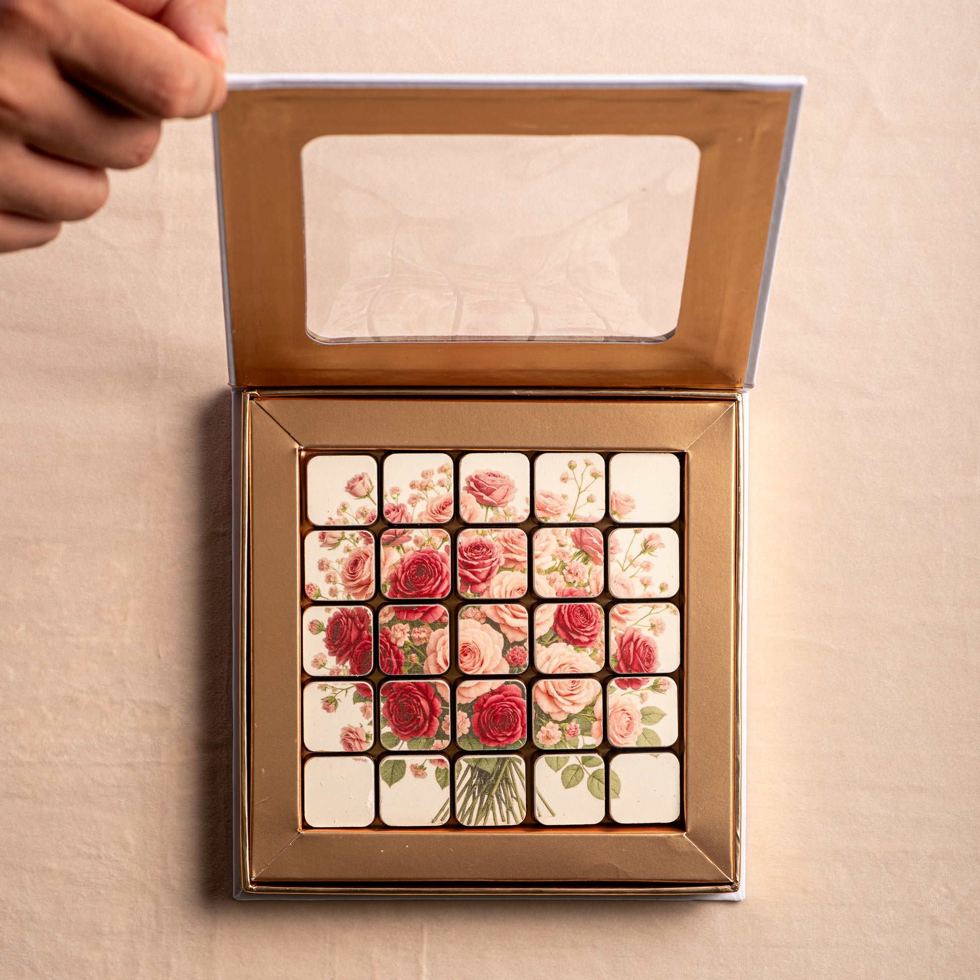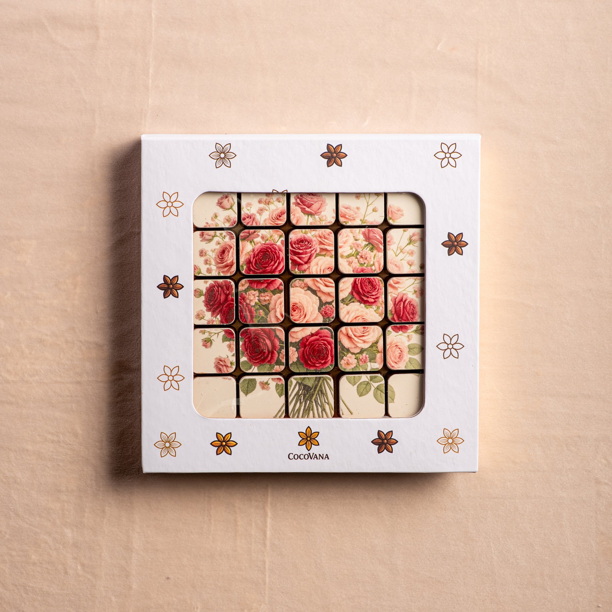 This stunning set features 25 handcrafted bonbons printed with one of our designs — each chocolate a piece of edible art. Paired with a a bouquet, it’s the perfect gift when words aren’t enough.