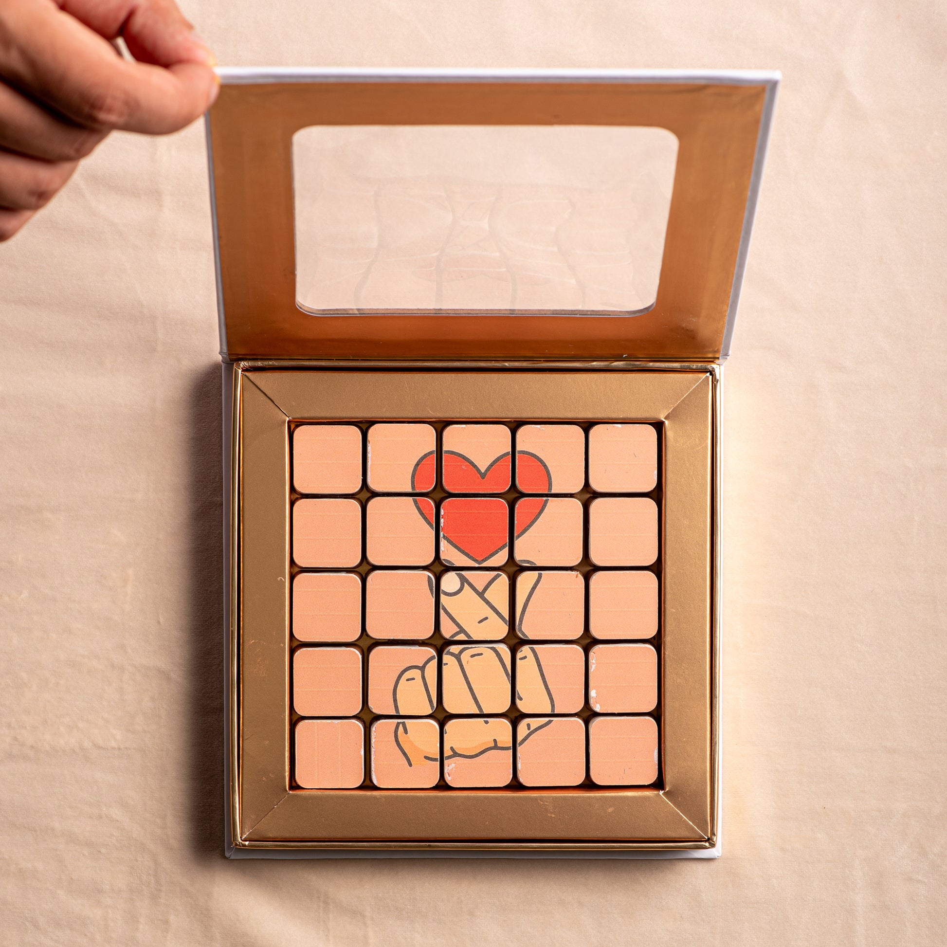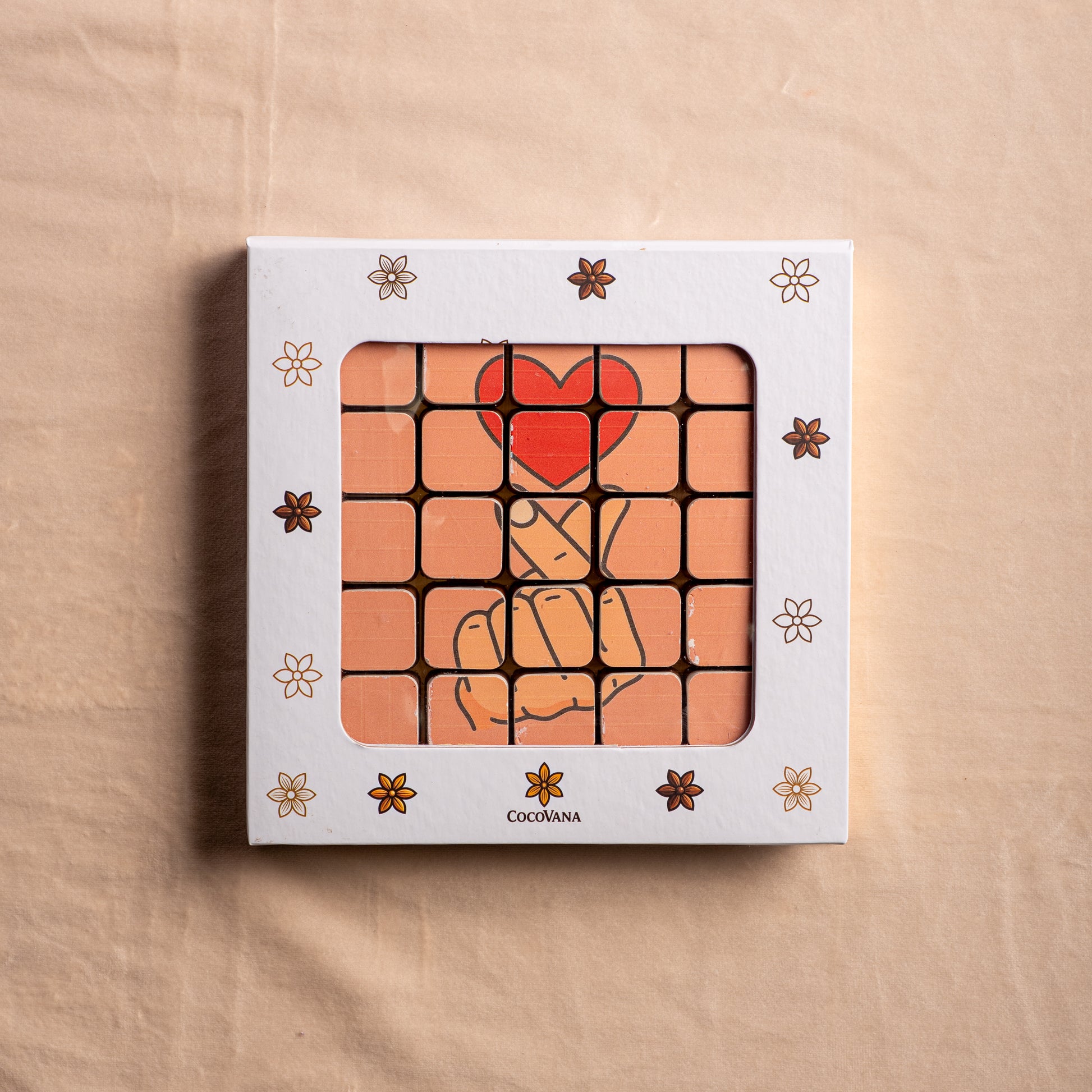 This 25-piece bonbon box features a stunning puzzle design, printed seamlessly across handcrafted chocolates with rich, assorted fillings.