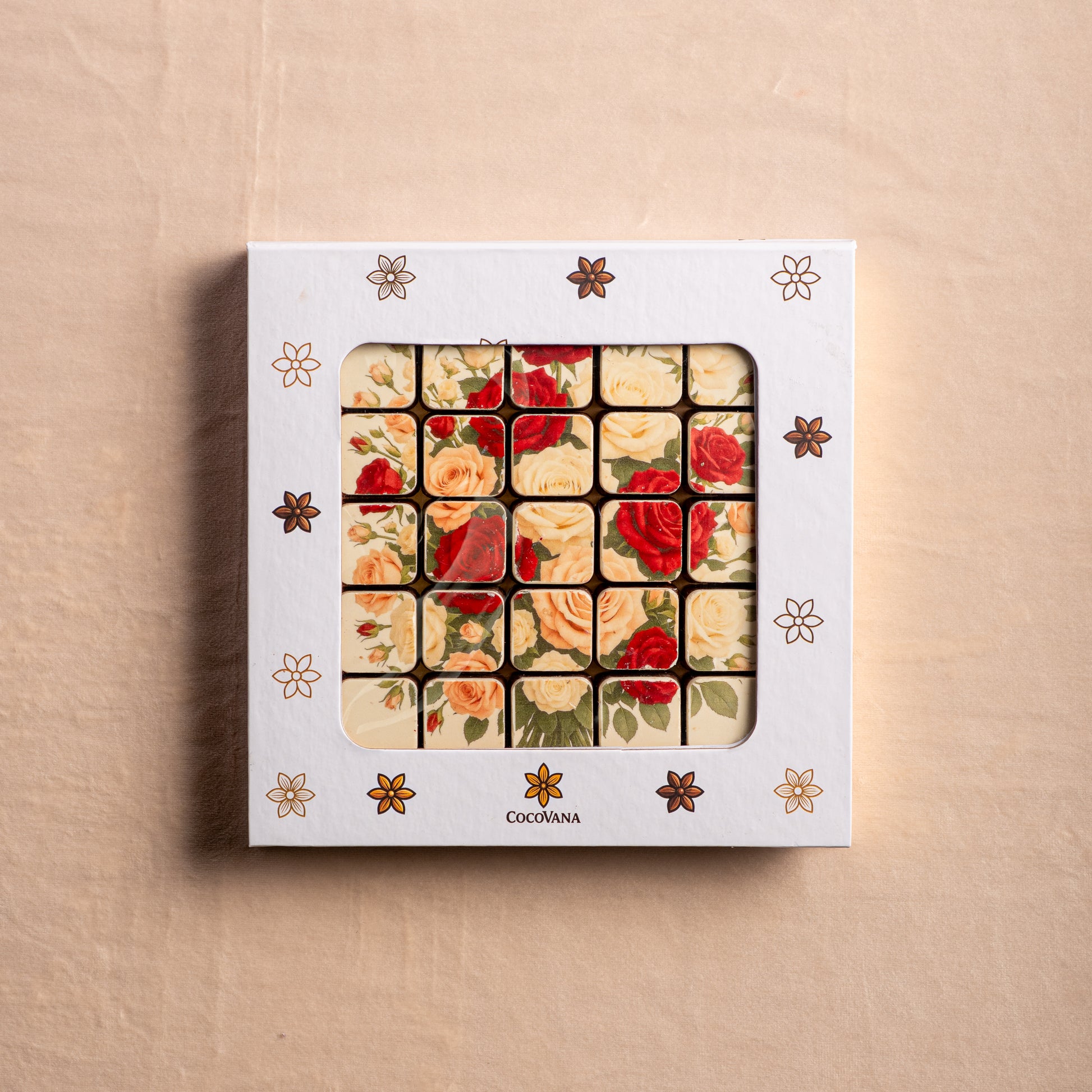 This stunning set features 25 handcrafted bonbons printed with one of our designs — each chocolate a piece of edible art. Paired with a a bouquet, it’s the perfect gift when words aren’t enough.